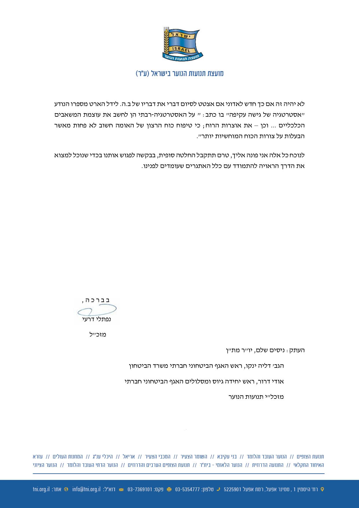 "תהיה זו טעות גדולה…לסגור בבת אחת עשרות מוקדים של פעילות לילדי ונערי העקורים מחבל אשכול, שער הנגב, שדרות ועוד ועוד", נאמר במכתב "זוהי החלטה רעה ובלתי מתקבלת על הדעת".