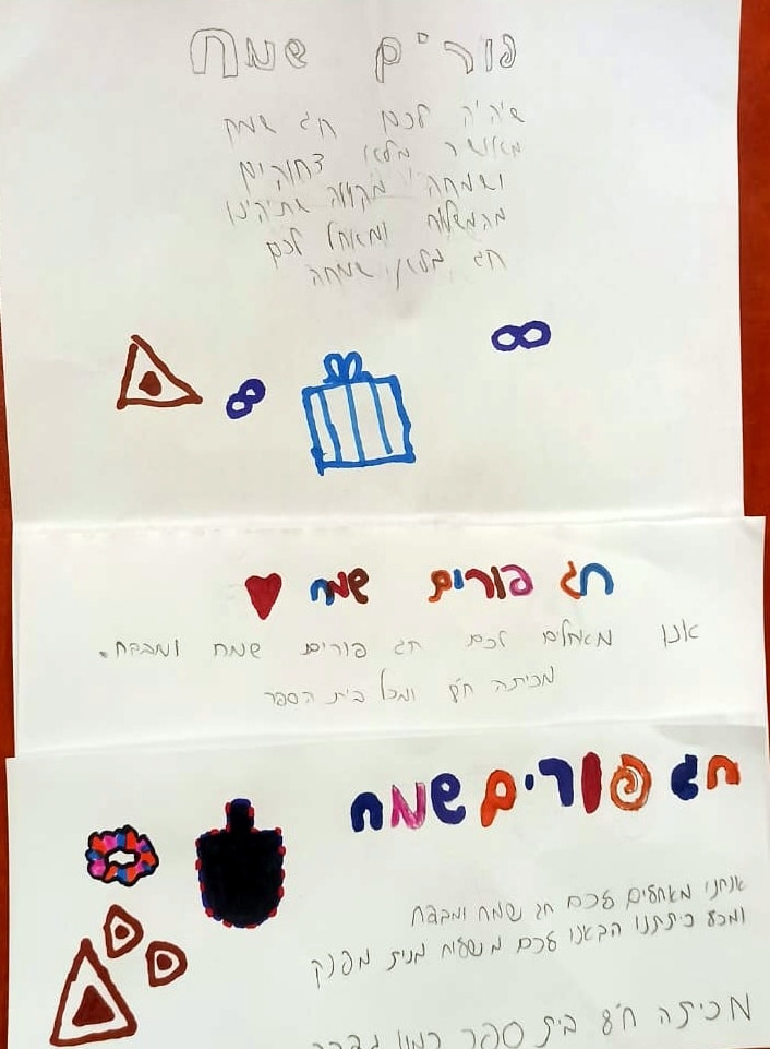לארגזים המפנקים צירפו התלמידים מילות עידוד ותודה. כך למשל תלמידי ח'3 כתבו: "לתחנת הכיבוי של גדרה, רצינו להודות לכם על העבודה המדהימה שאתם עושים בשבילנו ולאחל לכם פורים שמח מלא בתחפושות, מסכות, רעשנים, שירים, ריקודים והמון שמחה וכייף".