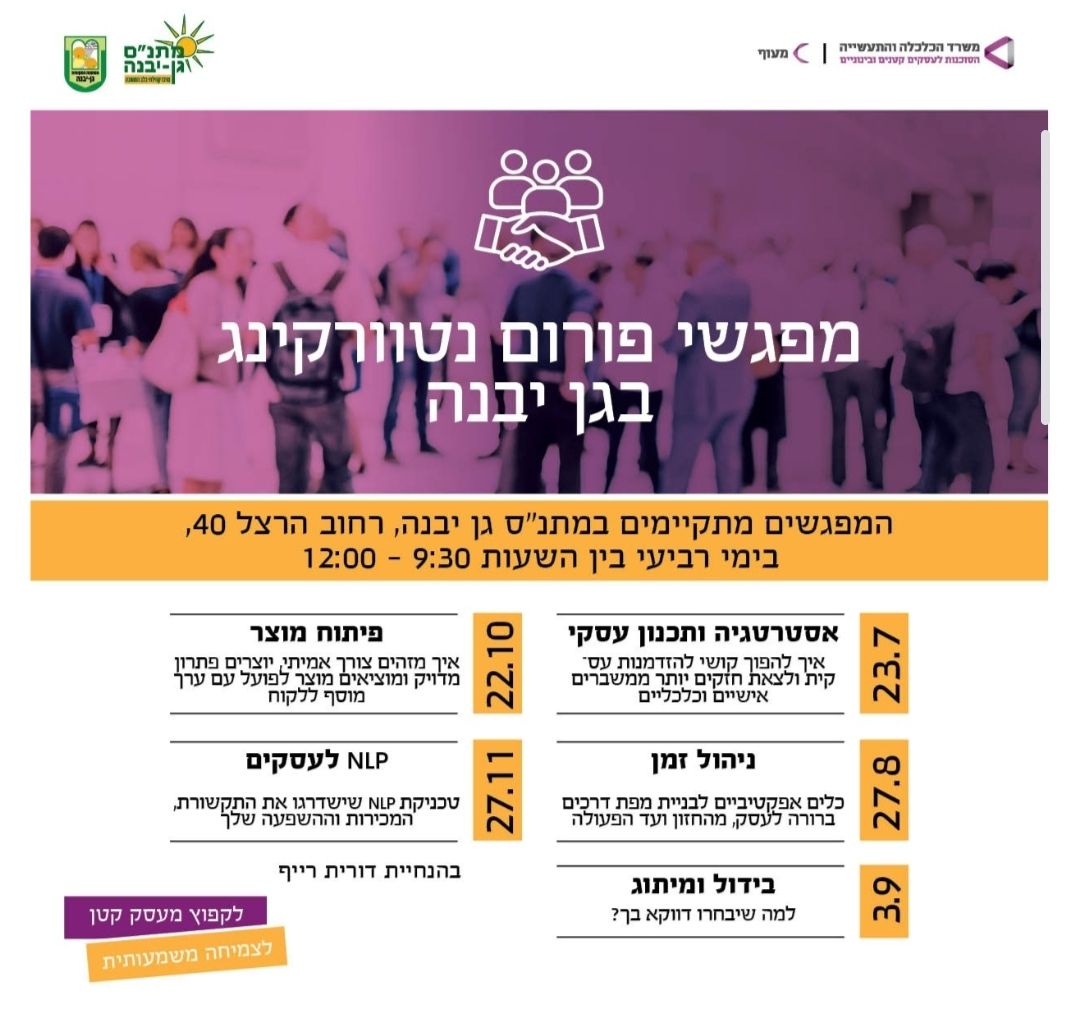 פורום העסקים של גן יבנה יקיים מחר, יום רביעי (22/10), בשעה 9:30 בבוקר, מפגש מרתק וממוקד ליזמים ובעלי עסקים, שיעסוק בנושא קריטי לצמיחה עסקית: "פיתוח מוצר – מהרעיון ועד הלקוח".