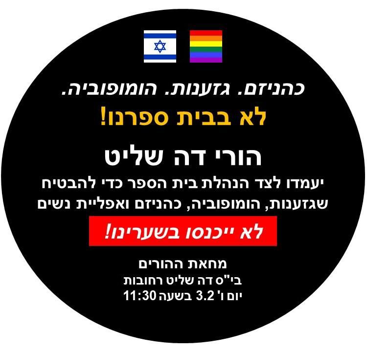 אנו מזמינים הורים מרחבי העיר להצטרף אלינו ביום שישי הקרוב למחאה ולהביע את חששם מפני הכנסת תכנים המנוגדים לרוח מגילת העצמאות של מדינת ישראל, תחת המסר: ״גזענות, כהניזם, הומופוביה ואפליה מגדרית – לא בבית ספרנו!״
