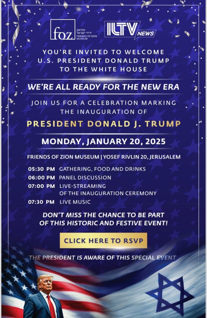 בנוסף, יקיים אירוע לרגל ההשבעה של טראמפ ביום שני 20/1 בשעה 18:00 במרכז המדיה של מוזיאון ידידי ישראל בהשתתפות שגרירים, מכובדים ואנשי מפתח ביחסי ארה"ב ישראל מייק אוונס, מייסד מוזיאון ידידי ישראל בירושלים ויועצו של טראמפ, ישיק בימים הקרובים קמפיין חדש של שלטי חוצות ענקיים ברחבי מדינת ישראל המברכים את הנשיא דונלד טראמפ על תחילת כהונתו כנשיא ארה"ב "Congregations Donald Trump Israel loves you".