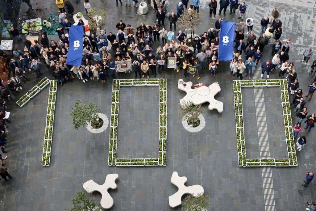 עובדי בזק שתלו למעלה מ-600 פרחים צהובים ב-100 אדניות ויצרו את המספר 100 כמניין הימים בהם החטופים בעזה.