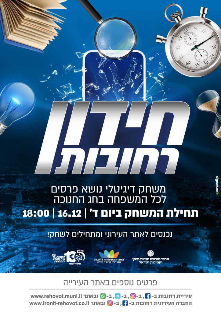 עיריית רחובות והחברה העירונית באמצעות מרכז מורשת יהדות תימן וקהילות ישראל יקיימו הערב (רביעי) חידון מדליק ודיגיטלי לציון 130 שנה להיווסדה של העיר רחובות. בשעה 17:45 יתקיים טקס הדלקת נרות חנוכה בשידור חי בעמוד הפייסבוק העירוני ובסיומו יוזנק החידון הדיגיטלי – שיחל בדיוק בשעה 18:00.
