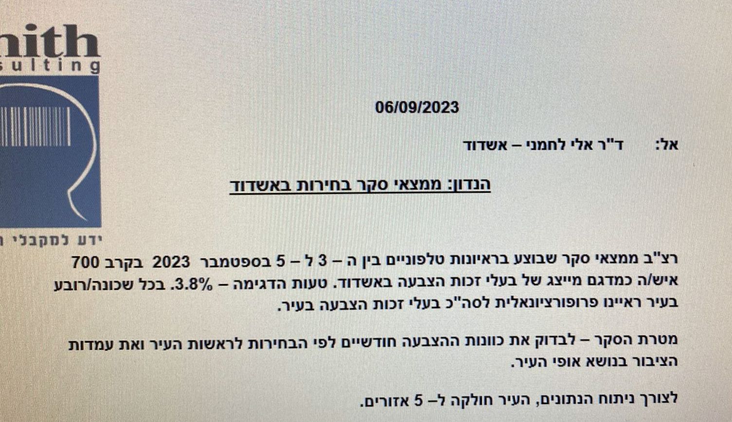 ד"ר אלי לחמני – יו"ר האופוזיציה המועמד לראשות העיר אשדוד מטיל ערב החג פצצה וחושף תוצאת סקר שביצע מכון סמית בראשות רפי סמית יום 6.9.23. לפי הסקר 57% מתושבי אשדוד החליטו: ד"ר אלי לחמני הוא המנהיג היחיד שיכול להוציא את אשדוד מהמצב הקשה והבעייתי בו העיר מצויה כיום"