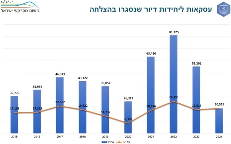 מבחינת עסקאות ליחידות דיור שנסגרו בהצלחה במחצית 2024, כאמור, נסגרו בהצלחה עסקאות ל-20,559 יח"ד, לעומת 19,513 יח"ד בתקופה המקבילה אשתקד.