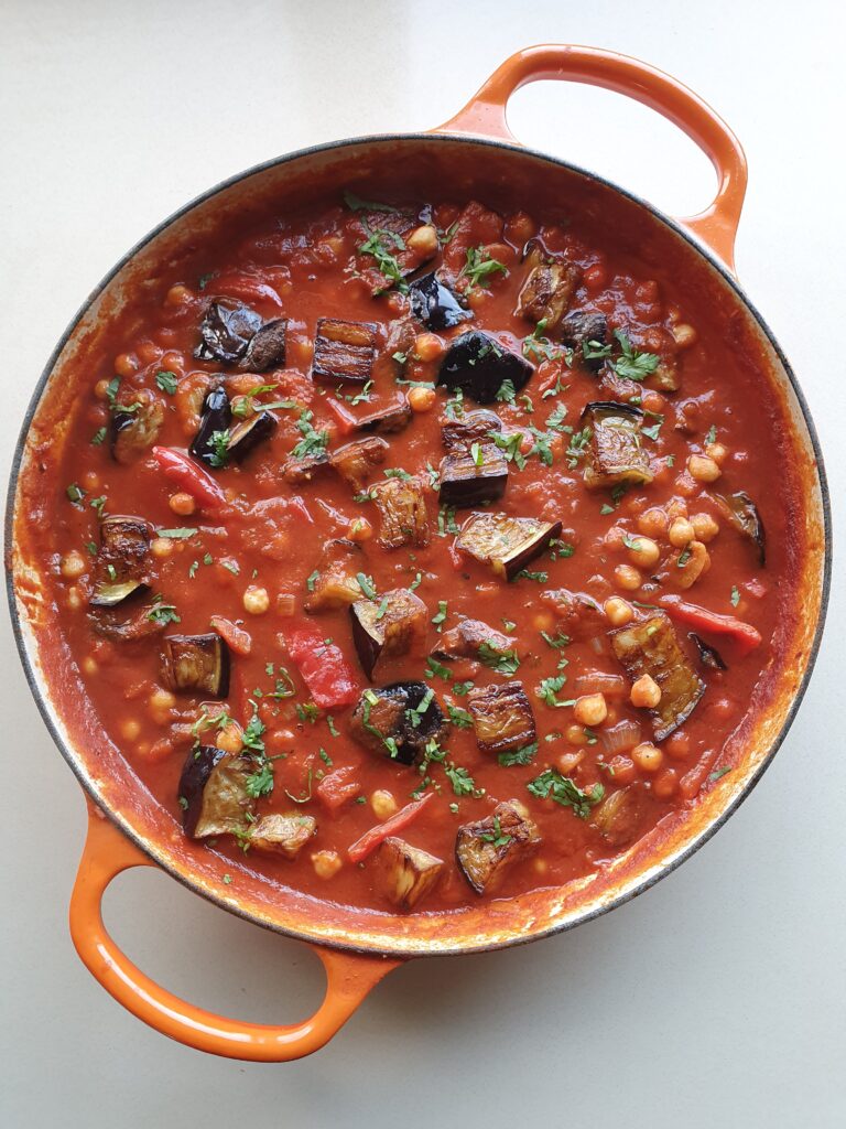 מתחילים בהשריית גרגירי החומוס: מעבירים לקערה, ממלאים במים ומשרים למשך הלילה. מסננים ומבשלים את החומוס בשפע מים, עד שהגרגירים רכים. מסירים את הקצף. במקביל משרים את הפלפלים היבשים במים רותחים למשך חצי שעה. אם משתמשים בטריים, פורסים אותם לאורך ומרוקנים מזרעים. מסננים את הפלפלים המיובשים מהמים, חוצים לאורך ומרוקנים מזרעים. מרוקנים מזרעים גם את הפלפל האדום ופורסים דק. מטגנים את הבצל בשמן זית בסיר רחב כ-5 דקות, עד להזהבה. מוסיפים שום ופלפלים, מערבבים ומטגנים 5 דקות נוספות. מוסיפים רסק עגבניות ותבלינים, מערבבים ומטגנים עוד דקה. מוסיפים עגבניות מרוסקות ומים ומביאים לרתיחה. מסננים את גרגירי החומוס המבושלים ומעבירים לסיר. מנמיכים את הלהבה ומבשלים חצי שעה. בינתיים ממליחים את קוביות החציל ומניחים על נייר סופג למשך 15 דקות, להגיר נוזלים. מנגבים בנייר. מחממים שמן לטיגון עמוק ומטגנים את קוביות החציל עד שהן מזהיבות היטב. מעבירים לסיר, מערבבים ומבשלים חצי שעה נוספת. אם צריך מוסיפים מים.