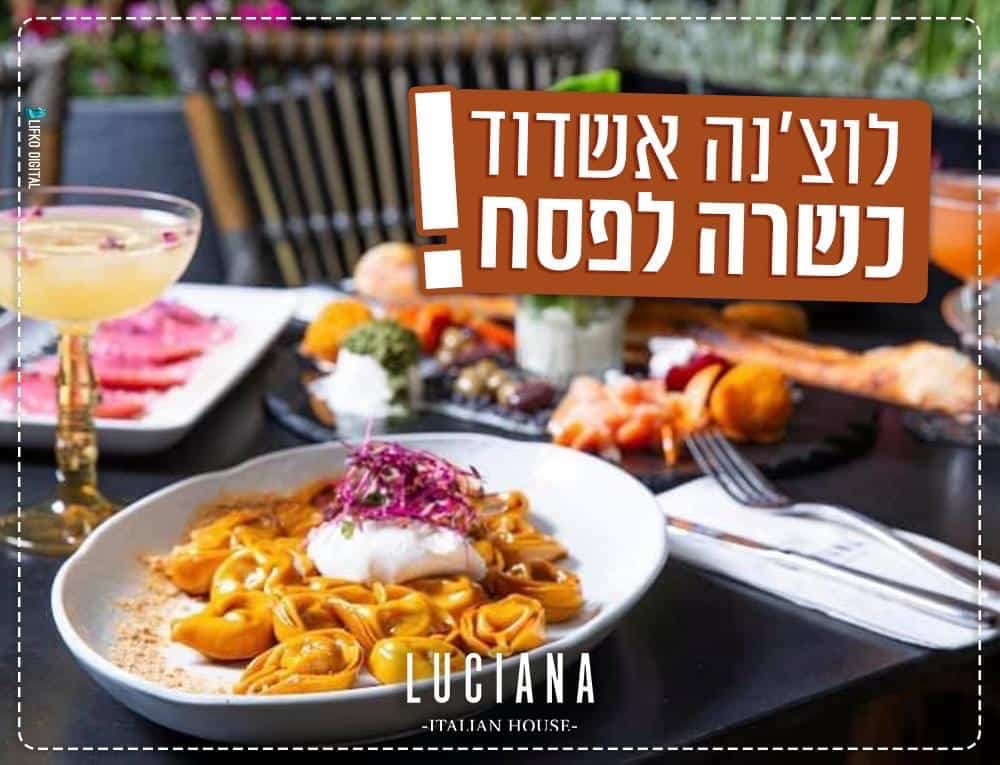 במסעדת לוצ'נה האיטלקית החלבית הממוקמת בסטאר סנטר אשדוד מציעים לאורך חול המועד מנות ראשונות קרות או חמות, סלטים, דגים, פיצות ופסטות כשרות לחג. הפיצות – מקמח תפוחי אדמה, עם תוספות מגוונות החל מפלפלים קלויים, דרך בצלים וכלה בארטישוק ופטריות. במחלקת הפסטות תוכלו ליהנות מפסטה מסוג פטוצ'יני, ברטבים שונים. המסעדה כשרה למהדרין, ללא חשש קטניות