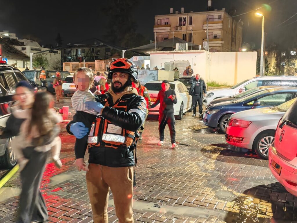 "יחד עם כוחות גדולים של מד"א הגענו לזירה שבה ראינו הרס רב, במספר בניינים היו לכודים שקראו לעזרה וכוחות הכיבוי ופיקוד העורף פועלים לחלץ אותם. שמענו צעקות לעזרה מתוך הבתים שנפגעו ואזרחים שהיו ברחוב סיפרו לנו שדיירים מבוגרים מתגוררים שם. בסמוך למקלט הציבורי שיש ברחוב ראינו מספר פצועים, גבר כבן 30 שסבל מחבלות מדממות בראשו ופצוע שנחבל קלות מרסיסים כשהיה בדרך למרחב מוגן. הענקנו להם טיפול רפואי שכלל עצירת דימומים וחבישות ואנחנו מפנים אותם לבית החולים סורוקה כשמצבם יציב. צוותים נוספים של מד"א מעניקים במקום טיפול רפואי לנפגעים נוספים"