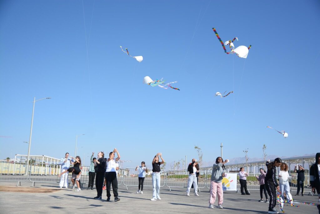 לקראת המפגש באילת הכין מרכז גי'נוגלי יחד עם אומנים מירושלים עפיפוני ענק כמחווה לילדים המפונים ולילדי אילת. במהלך האירוע הכינו הילדים 350 עפיפונים בגודל 50/35 עם מסרים (משפטי השראה, תפילה, ברכה) שהוכנו מראש עם המחנכות בכיתות. סגנית ראש עיריית אילת – עו"ד סימה נמיר הודתה למארגנים על הזכות להצטרף למיזם שמביא לידי ביטוי את התקווה והאהבה שמפיצים תושבי אילת מתחילת המלחמה וגם את שיתוף הפעולה ואת הקשר הנפלא שנרקם בין תושבי אילת הצעירים והבוגרים לבין תושבי עוטף ישראל המתארחים באילת.