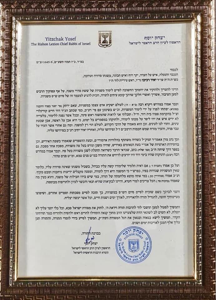 במעמד חגיגי שהתקיים ביום שני בערב בבית התרבות הישן בעיר, קיבל ראש העיר לוד, יאיר רביבו, מהראשון לציון, הרב הראשי לישראל ונשיא הרבנות הראשית לישראל, הגאון הרב יצחק יוסף שליט"א, תעודת הערכה והוקרה על שהגיע למעמד זה של סיום לימוד משניות של ששת סדרי משנה, על אף עיסוקיו הרבים למען תושבי העיר היקרים, בצרוף ברכתו החשובה להצלחתה, קידומה ושגשוגה של העיר לוד.