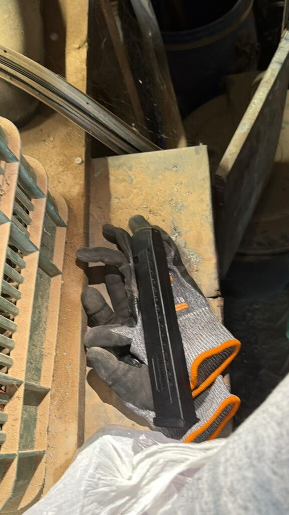 במהלך החיפוש שבוצע במתחם, בתוך מחסן נתפס אקדח מסוג גלוק יחד עם שתי מחסניות ובהן עשרות כדורים, מחסנית נוספת וכן תחמושת נוספת בקוטר 9 מ״מ.