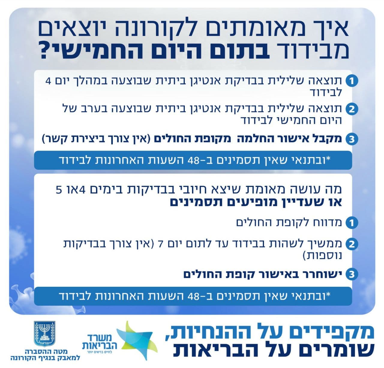 – תלמיד שתוצאת הבדיקה הביתית שלו *חיובית*: לא יגיע ללימודים וייגש להיבדק בתחנת בדיקה מפוקחת. אם תוצאת הבדיקה המפוקחת שלילית – התלמיד ישוב למוסד החינוכי לשגרת לימודים. אם תוצאת הבדיקה המפוקחת חיובית – התלמיד יבצע חמישה ימי בידוד מלאים עד להחלמה (בכפוף לבדיקות ביתיות בימים 4 ו-5 ולתוצאה שלילית בשתיהן).