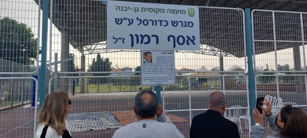 "תושבי גן יבנה היקרים, אנו שמחים מאוד ומתרגשים על קריאת מגרש ספורט על שם אסף אחינו ז"ל. אסף היה מאוד מחובר לספורט וכושר ואנו שמחים שמצאתם לנכון לשתף אותנו בכבוד הזה. מקווים שהמגרש ישמש אתכם היטב ויהיה חלק בהתפתחות של המקום המקסים הזה בחינוך לספורט ומצוינות. המון בהצלחה, משפחת רמון. תודה. "