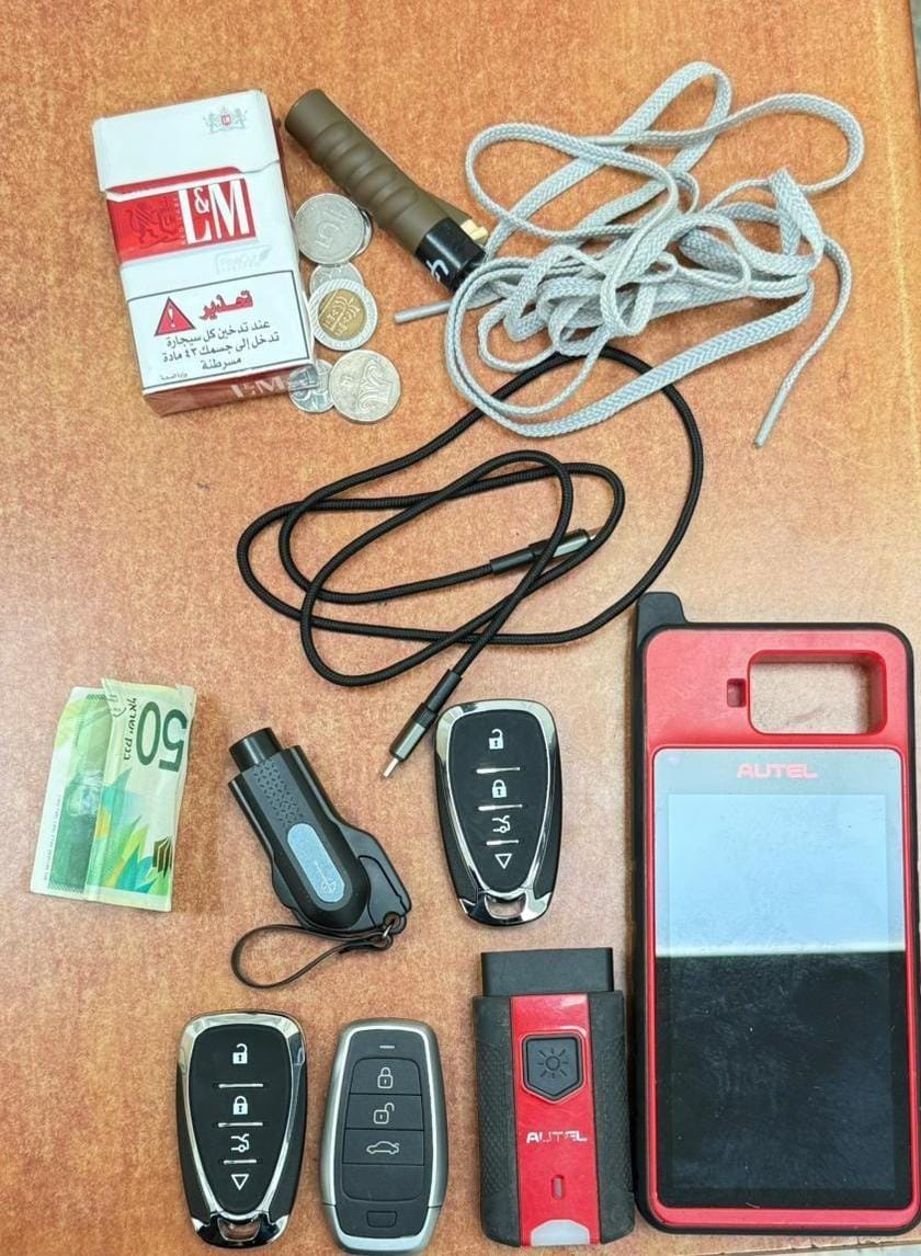 במהלך החיפוש שבוצע, נתפסו ברשות אחד החשודים כלי פריצה מתוחכמים, המעידים על כוונתם לגניבת רכב מקצועית: שלטים אוניברסליים, מנפץ שמשות, וכן מחשב וקונקטור מיוחדים המיועדים להנעת כלי רכב ללא מפתח מקורי. כמו כן, נתפס ברשותם כסף מזומן בסך 1,500 ש"ח ואותר רכב עם חלון מנופץ.