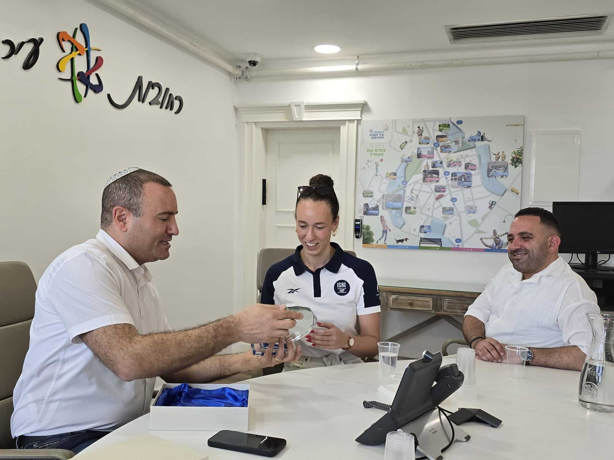 רגע לפני ההמראה, היא הגיעה למפגש מיוחד עם ראש העיר מתן דיל ומ"מ ומחזיק תיק הספורט אביב איטח ומנהל אגף הספורט בחברה העירונית דורון שימחי.