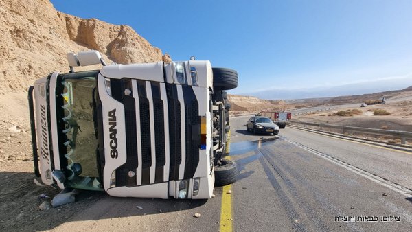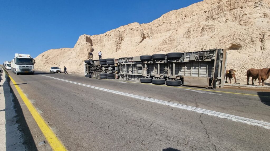 בכביש 90, צומת הערבה התקבל דיווח על התהפכות משאית המובילה בקר, צוותי כיבוי והצלה מתחנות דימונה, תמר וספיר בדרכם למקום.