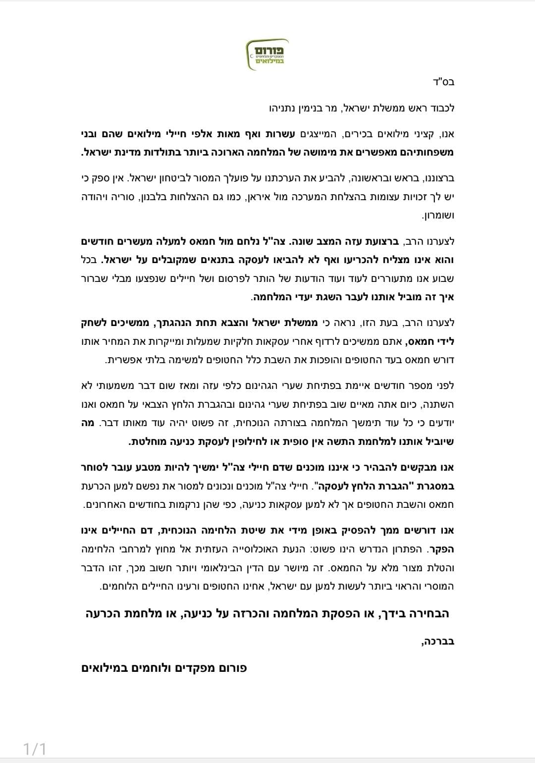 מאות קצינים במילואים, המייצגים את "פורום המפקדים והלוחמים במילואים", פנו הערב (מוצאי שבת) במכתב חריף ונוקב לראש הממשלה בנימין נתניהו. לטענתם, צורת הלחימה הנוכחית של צה"ל ברצועת עזה אינה יעילה ואינה מובילה להשגת יעדי המלחמה.