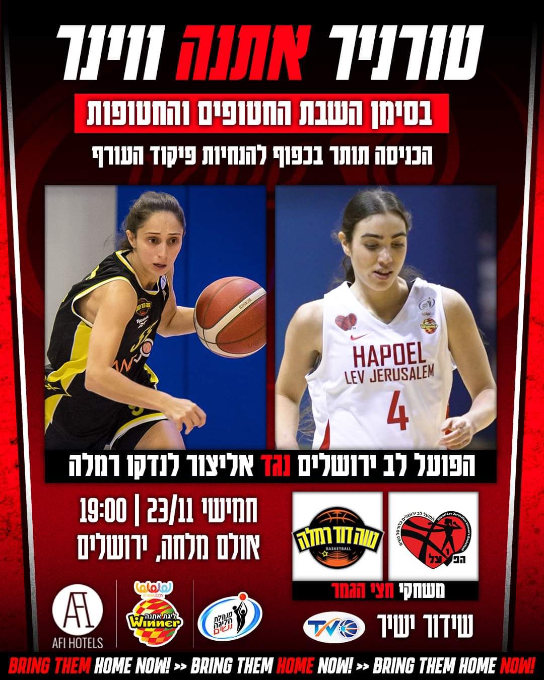 מחר, יום חמישי, 23/11 בשעה 1900 יתקיים משחק חצי גמר טורניר אתנה ווינר באולם הספורט מלחה בירושלים בסימן הזדהות עם משפחות החטופים ובמעמד משפחות.