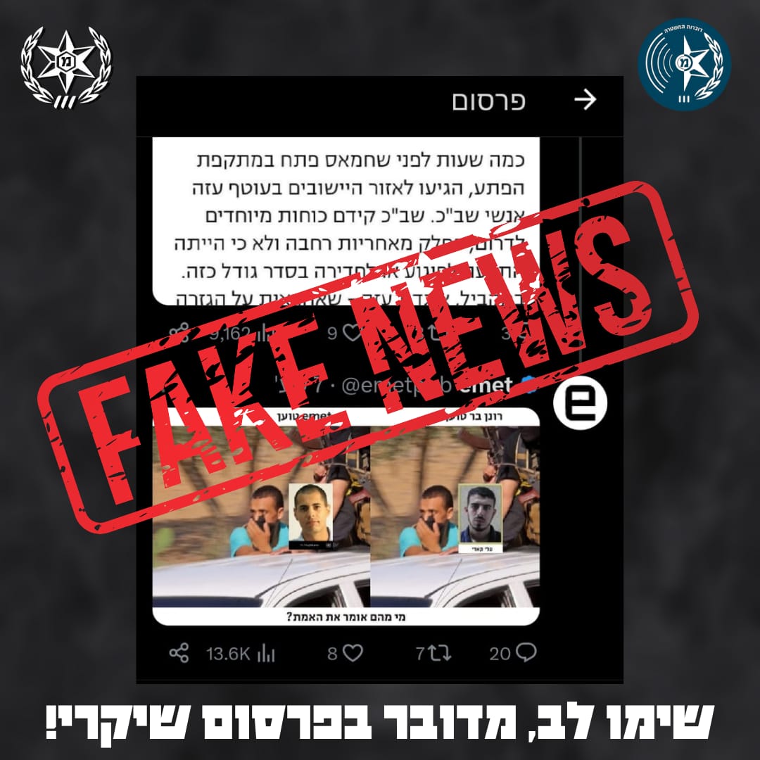 משטרת ישראל בהודעה חריגה: בניגוד לפרסומים כוזבים שעלו ברשתות החברתיות אודות שיתוף פעולה עם האויב של כוחות בטחון ושוטרים, שנפלו במהלך הלחימה בדרום והפצת תמונותיהם לצד תמונות מחבלים, הרי שמדובר בפרסום שקרי ונבזי שמטרתו ליצור בהלה בקרב הציבור.