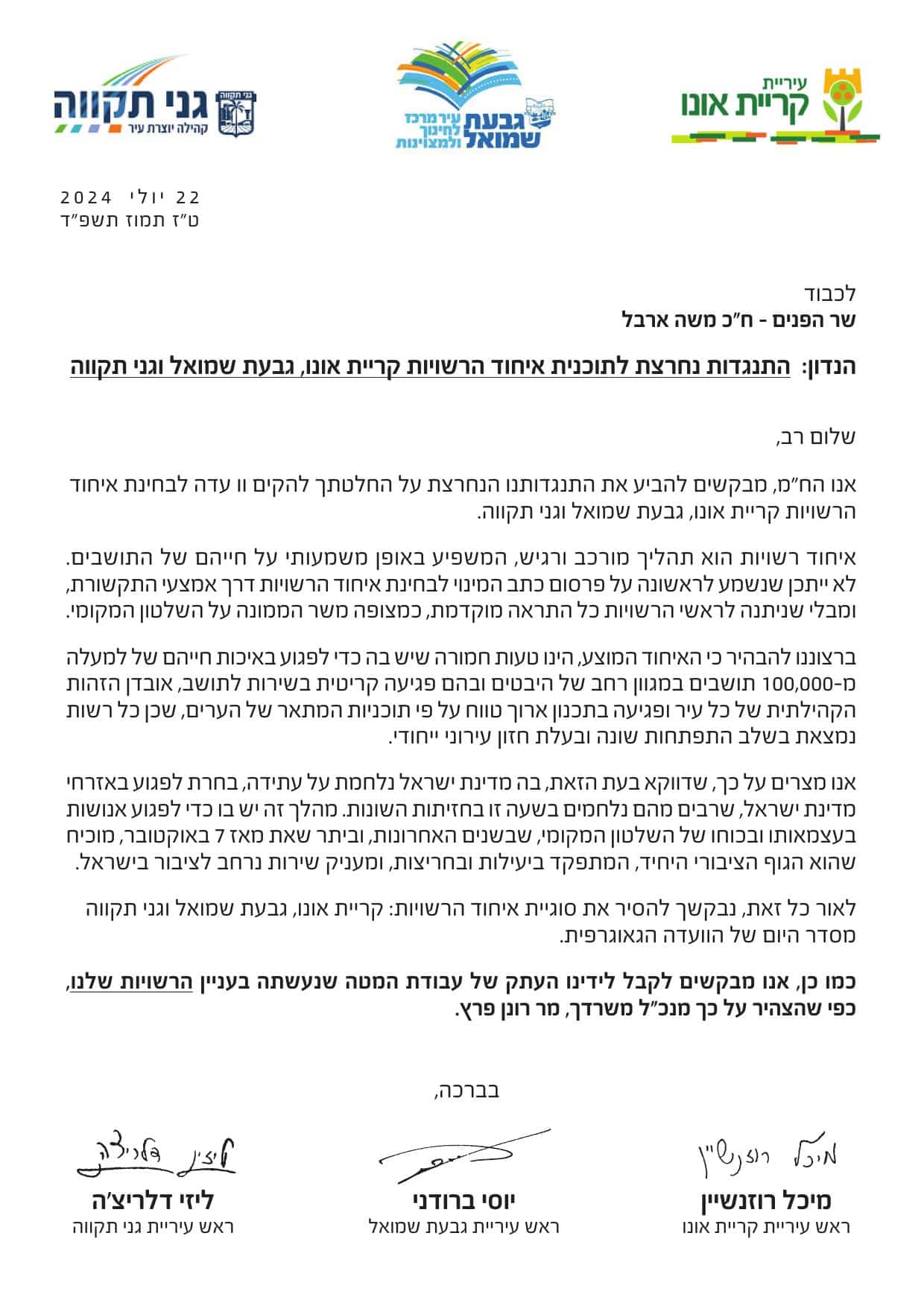 "החלטת שר הפנים, עת צירף את קריית אונו, גני תקווה וגבעת שמואל למהלך איחוד הרשויות דורשת בחינה מחדש. אין מדובר באיחוד בין רשות גדולה לרשות קטנה לשם שיפור השירות לתושבים, אלא בהחלטה שרירותית לאחד שלוש ערים, שכל אחת מהן הצטיינה בטיפול בתושביה הן במשבר הקורונה והן במלחמת חרבות ברזל. בשלוש הרשויות מתבצעת בשנים אלה תוספת אוכלוסין ושלושתן מציגות תקציב עירוני יציב והנהלת עיר יציבה. על כן אני פונה לשר הפנים בדרישה להסיר את הנושא מסדר היום ולאפשר לכל אחת משלוש הרשויות להמשיך להעניק לתושביהן את השירות המצויין שניתן להם כעת".
