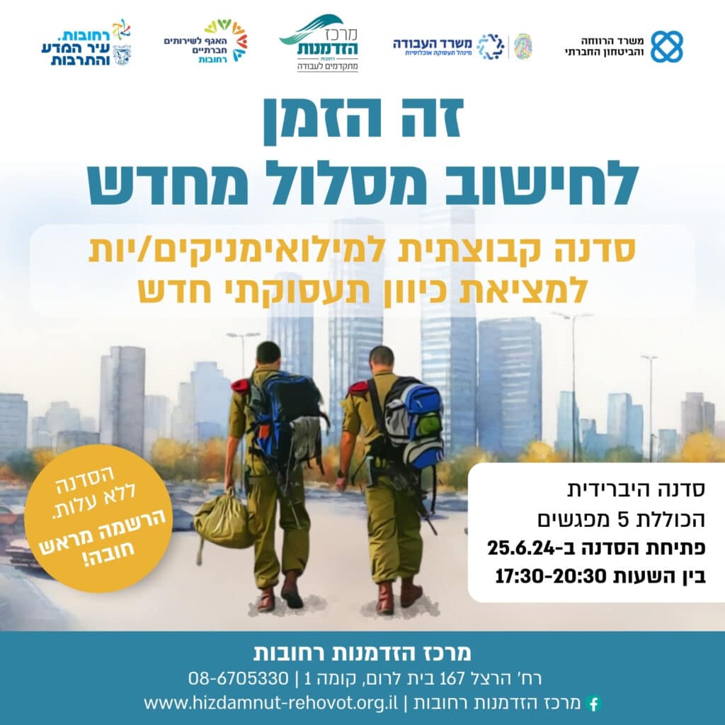 מרכז הזדמנות – המרכז לקידום התעסוקה ברחובות מזמין את נשות ואנשי המילואים להצטרף לסדנה חדשה – "חישוב מסלול מחדש" שנועדה לעזור בהתמודדות עם החזרה לעולם העבודה.