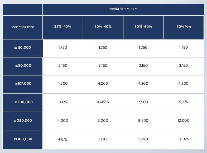 עסקים שמחזור העסקים שלהם הוא 12,000 ש״ח – 300,000 ש״ח בשנה: עסקים אלו יהיו זכאים למענק המשכיות עסקית קבוע בהתאם לרמת הפגיעה בעסק ולפי הפירוט בטבלה המצורפת (טבלה 1).