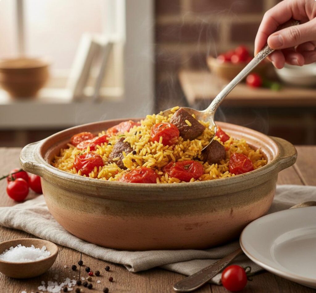 המנה מתבססת על נתחי בשר שריר (מספר 8), שנחשבים לאידיאליים לבישול ארוך בשל יכולתם להפוך לרכים ונימוחים במיוחד. הטוויסט המרכזי של יהודית הוא השימוש בעגבניות אדומות ובשלות, שמהוות את הבסיס לנוזלי הבישול ומעניקות לאורז היסמין מתיקות טבעית וחמיצות עדינה המאזנת את הבשר. התהליך מתחיל בטיגון איטי של בצל, צריבה של הבשר וריכוך העגבניות, ורק לאחר שהטעמים נספגים – מוסיפים את האורז לבישול ראשוני לפני הכניסה לתנור. המתכון הזה הוא יותר מסתם הוראות הכנה; הוא חלק מההיסטוריה הקולינרית של ירושלים, וכעת הוא יוצא מהסיר של שוק מחנה יהודה ישירות למטבח הביתי שלכם.