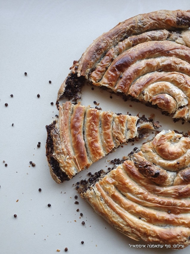 משמנים היטב את משטח העבודה ואת כפות הידיים ומתחילים לפתוח את אחת הפיתות בעזרת כרית כף היד, עד שמתקבל עלה דק מאד וכמעט שקוף. חותכים את השוליים לקבלת צורת מלבן או ריבוע. מניחים לרוחב הבצק "שורה" של המלית ומגלגלים לרולדה הדוקה. מעצבים לשבלול קטן או גדול (יחד עם שאר הרולדות) או לצורה של אוזני פיל. ממשיכים למלא את כל הפיתות. מחממים תנור על 200 מעלות טורבו. מברישים את המאפים בביצה טרופה או שמן, מפזרים שומשום ומכניסים לתנור החם ל 12-15 דקות. מאפה אחד גדול יש לאפות בתבנית עגולה כ-25 דקות.
