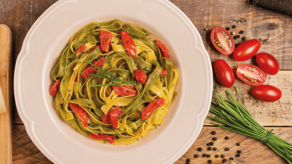 חברת ישרקו חולקת מתכון לפסטה טיאטלה ביצים תרד ועגבניות שרי, עירית וגבינת פקורינו.