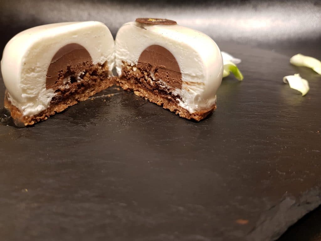 מחממים את החלב עם המקל וניל והסוכר ומוסיפים את הג'לטין עד שמקבלים מרקם אחיד ומכבים את האש, יוצקים את המסה החמה על המטבעות שוקולד הלבן ומחברים את המסה למרקם אחד, מוסיפים את המסקרפונה וממשיכים לערבב עד לקבלת מרקם אחיד ומסה חלקה, מקציפים את השמנת מתוקה הקצפה רכה ומקפלים לתוך השמנת המוקצפת את המסה ומחברים הכל יחדיו. במקביל מחממים את החלב והשמנת על האש, לקראת רתיחה מוסיפים ג'לטין, עושים השוואת טמפרטורה עם החלמונים ומחזירים לבישול קצר ועדין על האש עד שהמסה מסמיכה (מרקם כמו של טחינה), יוצקים על השוקולד המריר וטורפים עם מטרפה עד שמקבלים מרקם חלק, יוצקים לתבנית שקעים פרלין ומקפיאים.