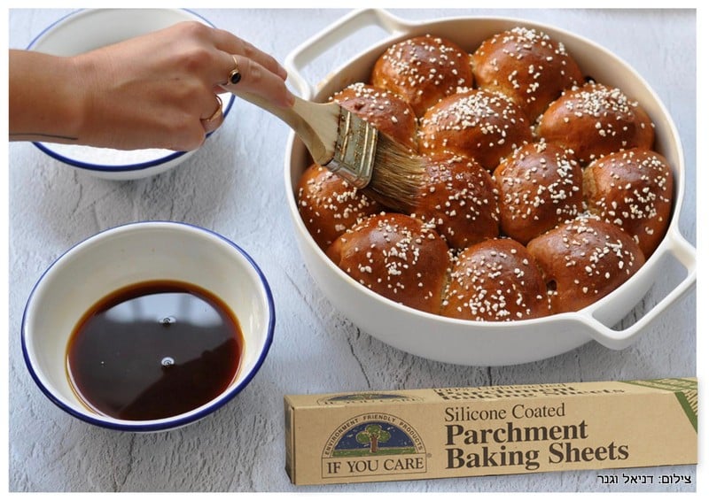 לאחר ההתפחה, מחלקים את הבצק ל-12 כדורים שווים במשקל 70-75 גרם ליחידה. מסדרים את הכדורים בתבנית עגולה עם מעט מרווחים עם נייר אפייה אקולוגי If You Care, מברישים בחלב סויה ומעבירים להתפחה שניה של כ-40 דקות כשהתבנית מכוסה במגבת. בינתיים מחממים תנור ל 180 מעלות מברישים את הלחמניות שוב בחלב סויה ומפזרים סוכר גבישי אם רוצים. אופים את הלחמניות כ-30 דקות עד שהן מקבלות צבע שחום.