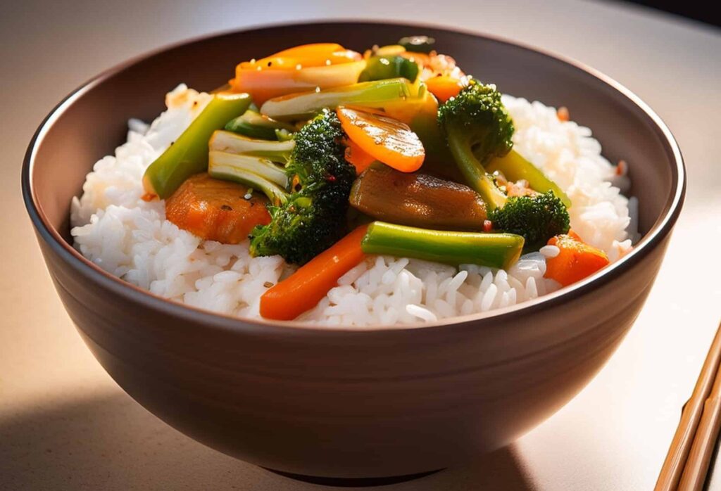 מוסיפים את האורז המבושל לווק וגם את החצי השני של רוטב הסויה ומערבבים היטב.