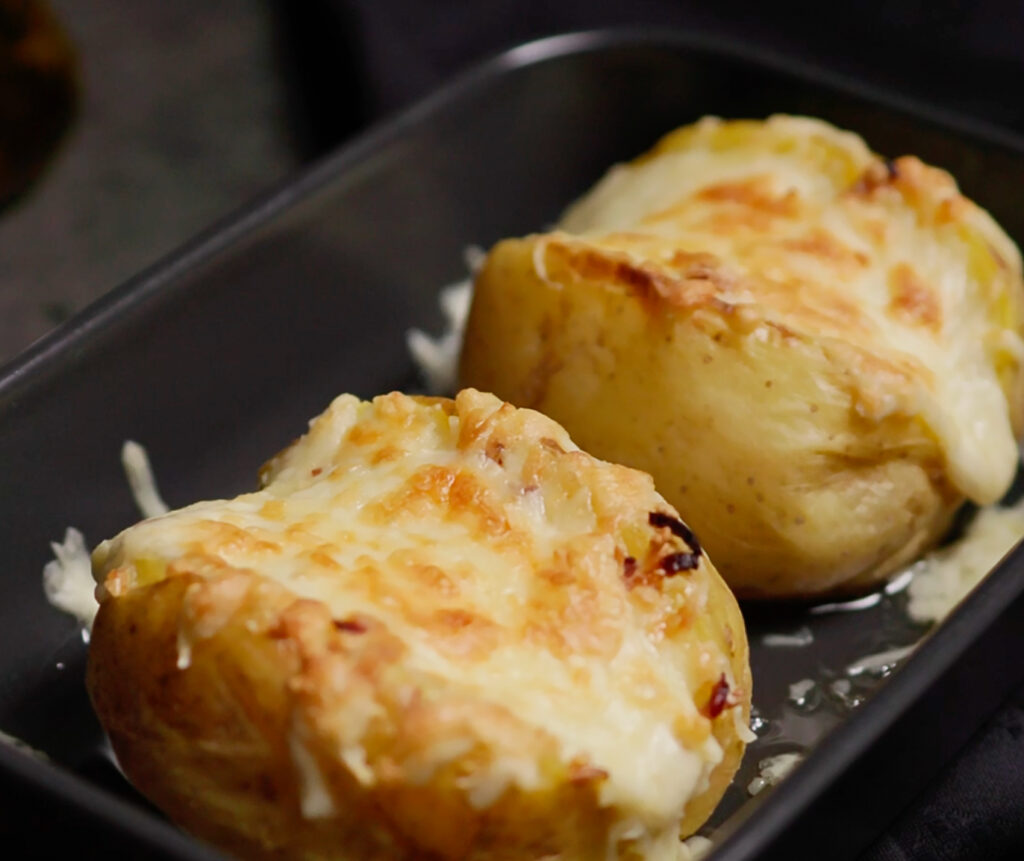 מניחים גבינה מגוררת בתוך תפוח האדמה ומכניסים למיקרוגל כדי לצלות את הגבינה, למשך 7 דקות.
