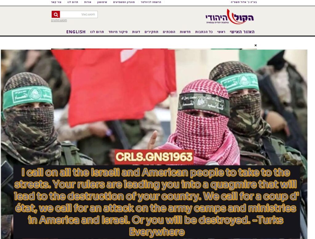"אנו קוראים לכל העם הישראלי והאמריקאי לצאת לרחובות. השליטים שלכם מובילים אתכם לביצה טובענית שתוביל להשמדת המדינה שלכם. אנו קוראים להפיכה, אנו קוראים לתקוף את מחנות הצבא והמשרדים הממשלתיים באמריקה ובישראל. או שתיהרסו"