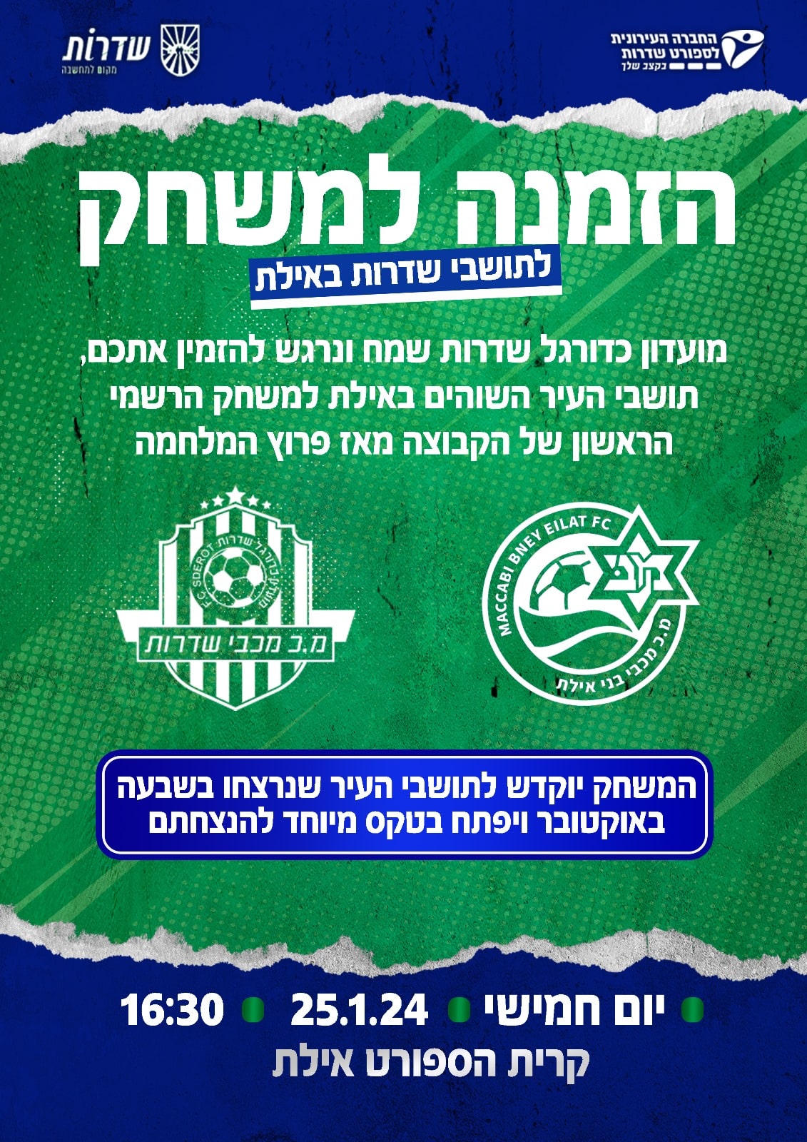 המשחק, נגד מכבי בני אילת, יתקיים בקריית הספורט אילת ושריקת הפתיחה תושבי ב 16:30. מדי הקבוצה עוצבו על ידי אורי גבאי, מצוות הקבוצה ותושב העיר, במטרה להנציח את עשרות מתושבי העיר שנפלו במתקפת ה 7.10 ושמותיהם יוצרים את צורת מגן הדוד.