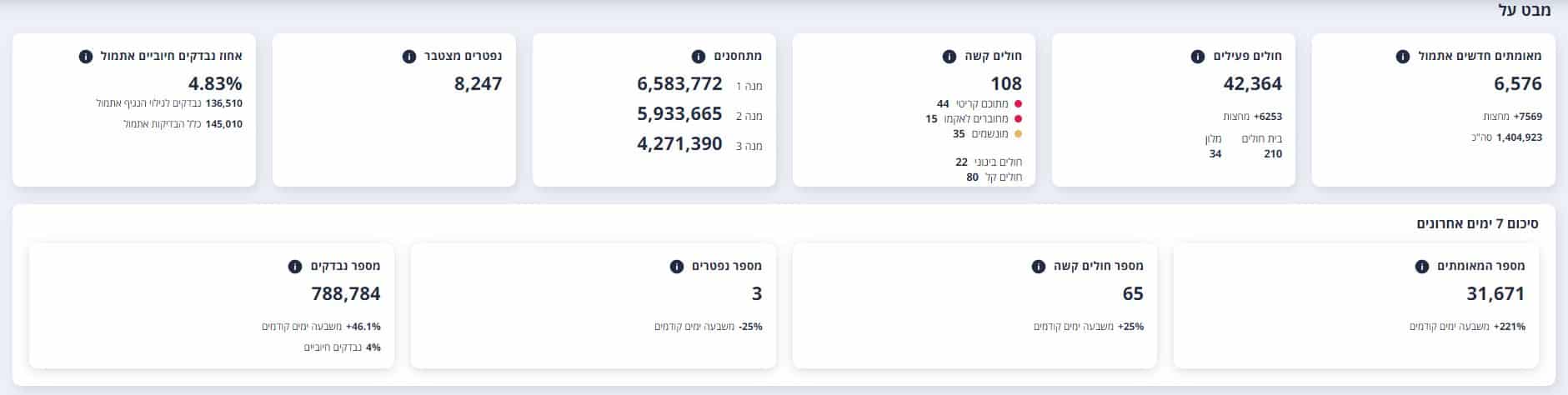 בסיכום שבעת הימים האחרונים עומד מספר המאומתים על 31,671, מדובר בעלייה של 221% משבעת הימים הקודמים; 65 חולים קשים, עליה ש 25% משבעת הימים הקודמים, 3 נפטרים – ירידה של 25% משבעת הימים הקודמים ו-788,784 נבדקים, גם כאן נרשמה עליה בגובה 46.1% ביחד לשבעת הימים הקודמים, בהם 4% חיוביים.