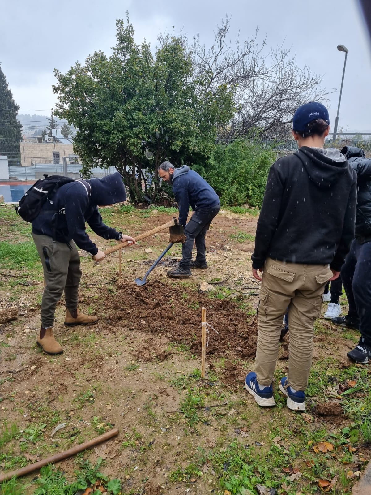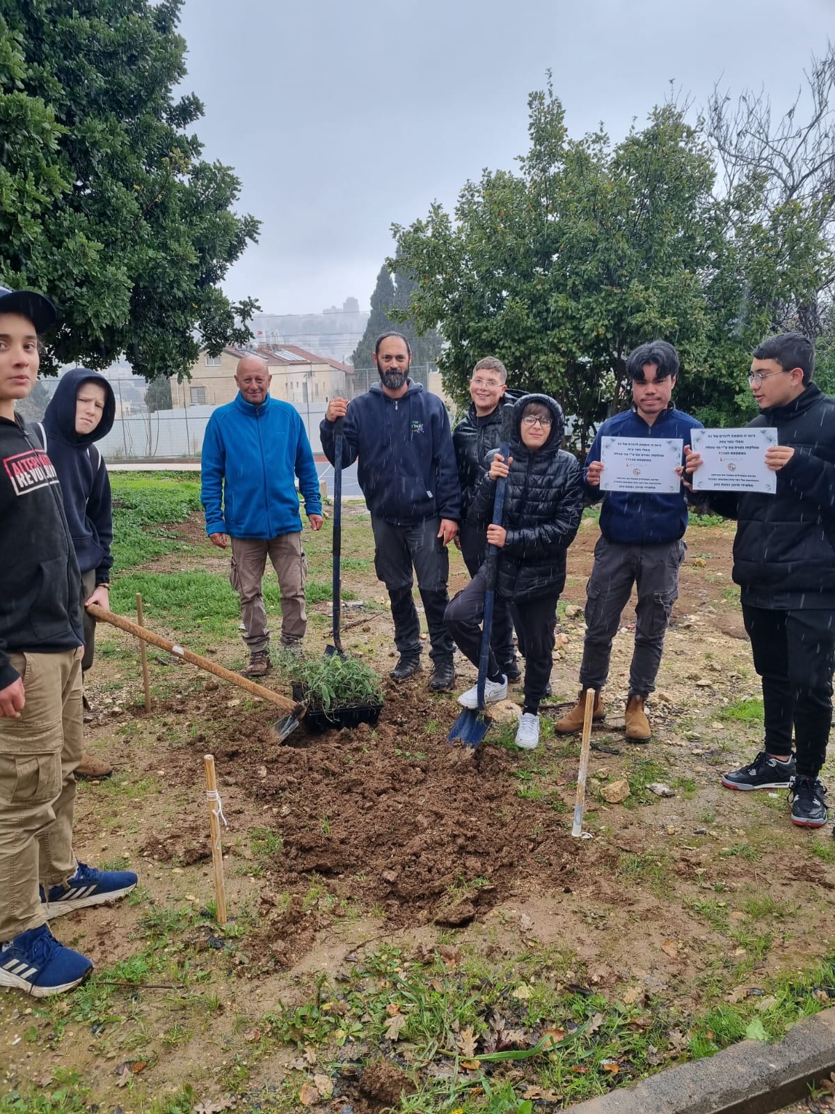 לרגל ט"ו בשבט: תלמידי תיכון גבעת גונן ותלמידים מפונים מקרית שמונה ששוהים בבירה נטעו בחצר בית הספר שתילים לזכרם של הנרצחים בכפר עזה.