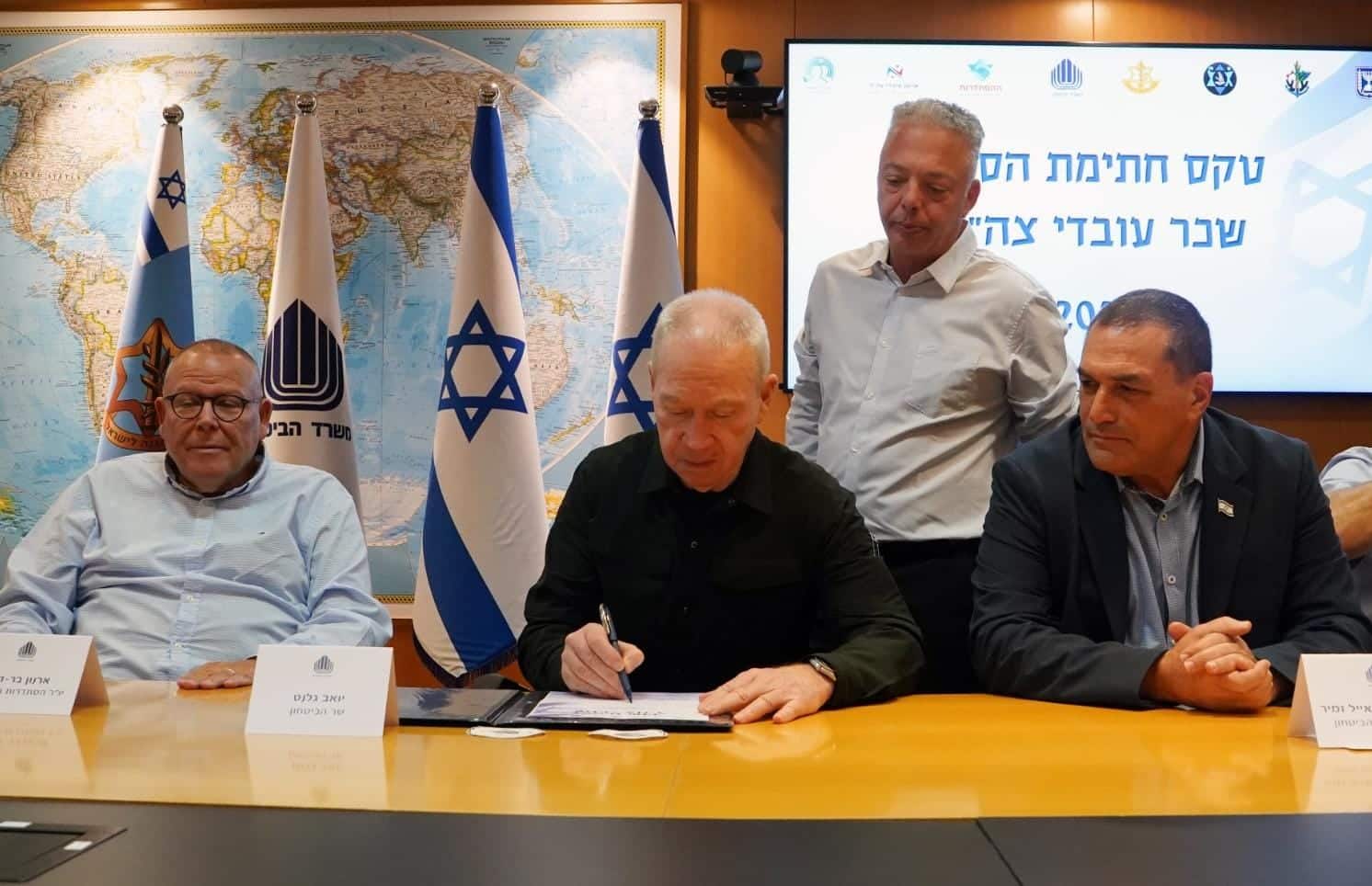 על הסכם השכר החדש לאזרחים עובדי צה"ל חתמו השבוע במשותף שר הביטחון יואב גלנט, יו״ר ההסתדרות ארנון בר-דוד, הממונה על השכר במשרד האוצר אפי מלכין, מנכ״ל משרד הביטחון אלוף (מיל׳) אייל זמיר, סמנכ״ל וראש אגף התכנון במשרד הביטחון איתמר גרף, ראש אגף כוח אדם אלוף יניב עשור ויו״ר ארגון עובדי צה"ל מאיר בן הרוש.