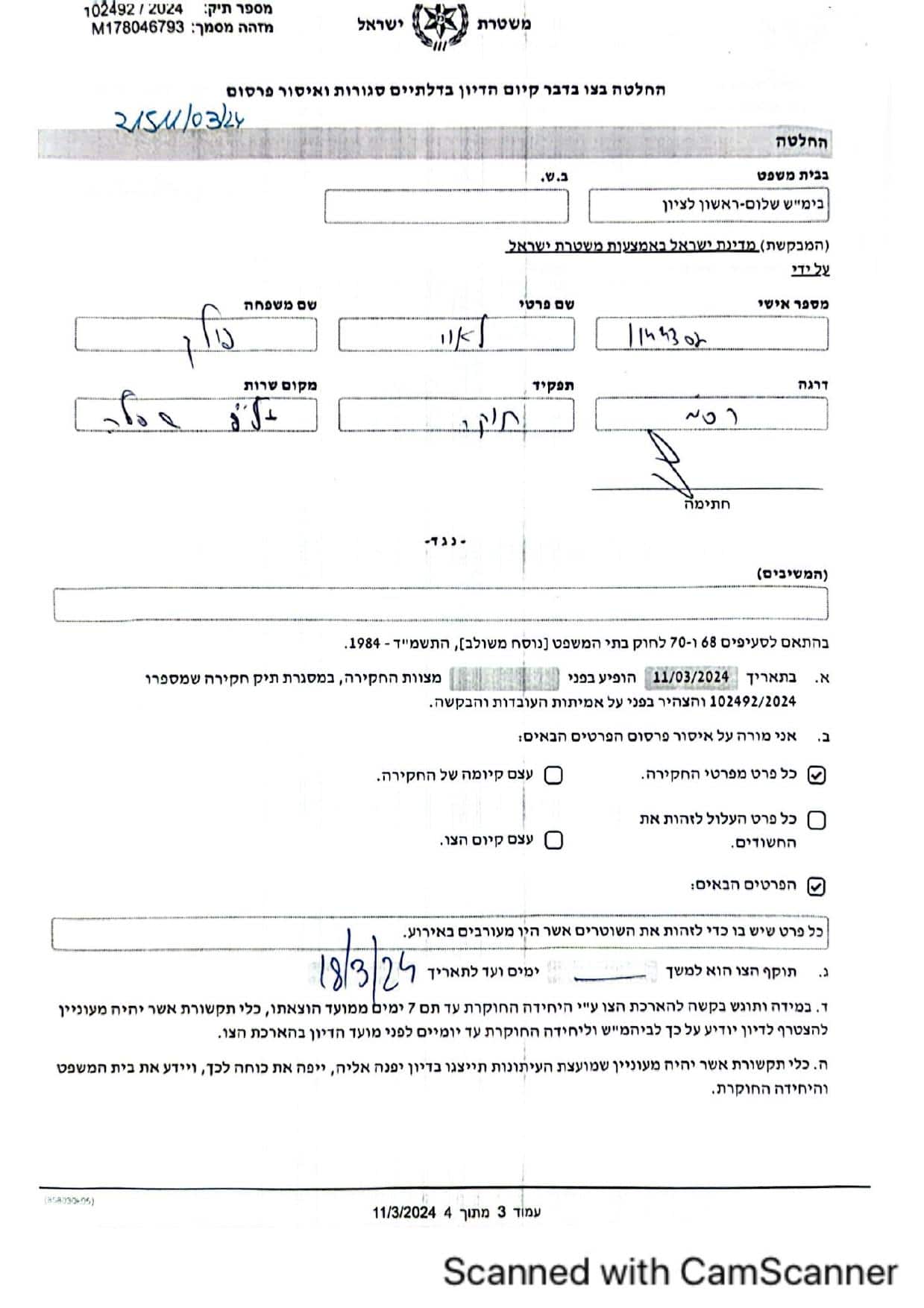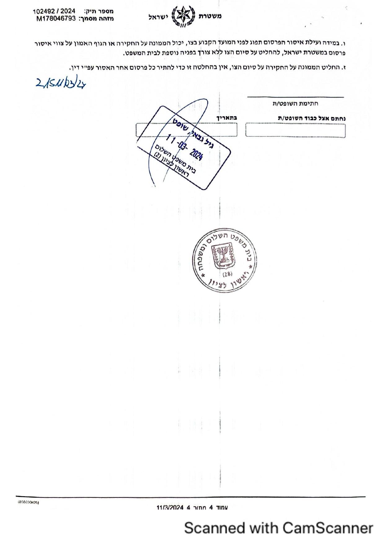 הצו אוסר לפרסם כל פרט מפרטי החקיֹרה וכל פרט שיש בו כדי לזהות את השוטרים המעורבים ותוקפו עד תאריך 18.3.24 .
