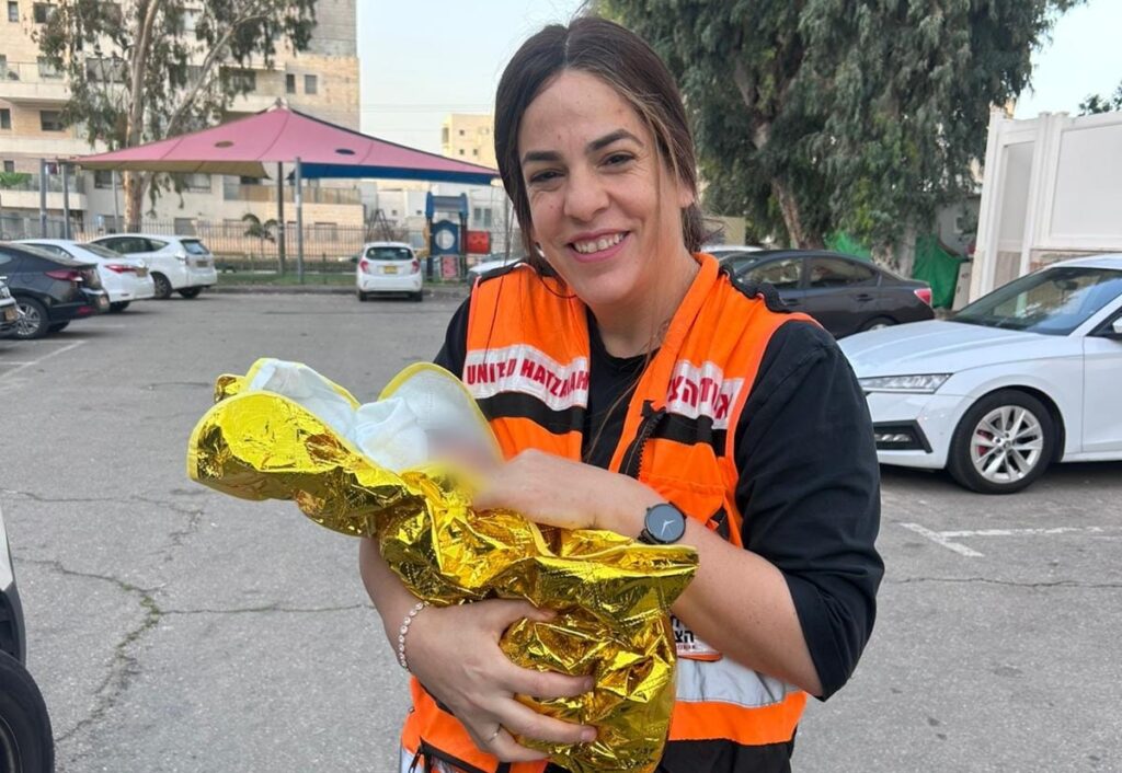 בתמונה שהופצה על ידי הדוברות, נראית שמחה לאה אלון – מיילדת במקצועה מלבד היותה חובשת מתנדבת באיחוד הצלה – כשהיא מחזיקה את הרך הנולד עטוף בשמיכת מילוט מוזהבת, חיוך רחב על פניה – רגע שמסכם את כל המהות של הצלת חיים והבאת חיים לעולם.