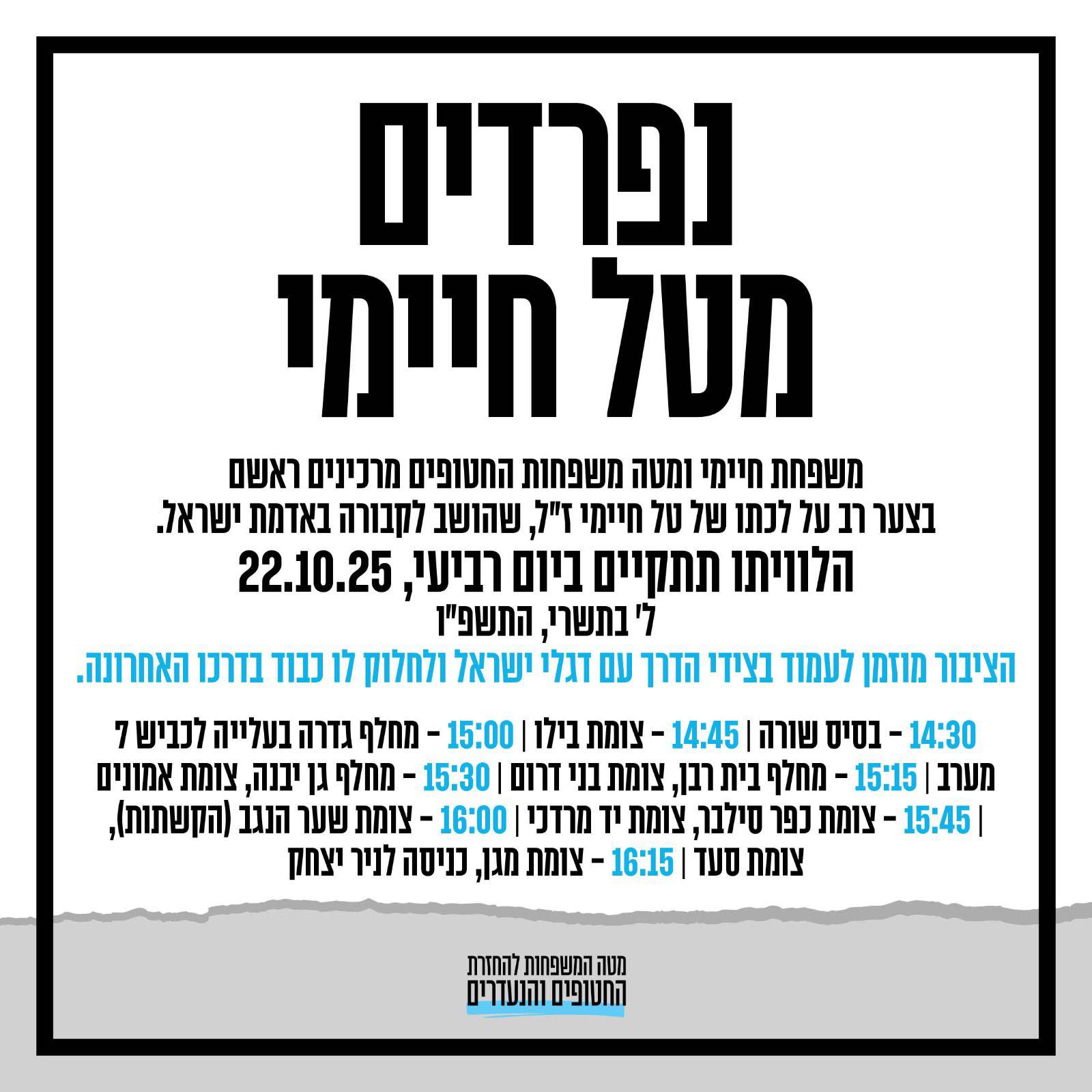 “טל חוזר הביתה,” נמסר ממטה המשפחות, “ואיתו שב חלק מהלב של כולנו. עם ישראל מתאחד בדרכו האחרונה של גיבור, שנחטף אך לא נשכח לרגע.”