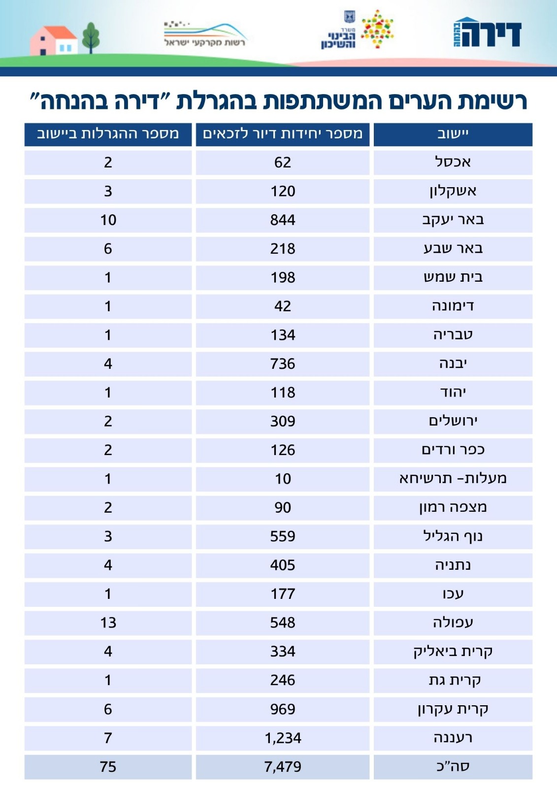הבוקר, יום ראשון ה־10.8.25, ט”ז באב תשפ”ה, נפתחה ההרשמה להגרלה העשירית של תכנית “דירה בהנחה”, במסגרתה יוגרלו 7,479 דירות ב־75 הגרלות ב־24 יישובים ברחבי הארץ.