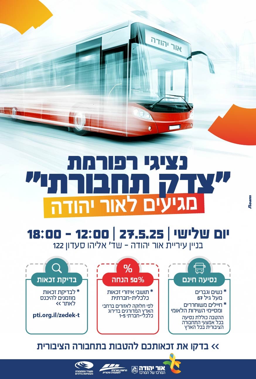 נציגי רפורמת "צדק תחבורתי" מגיעים לאור יהודה ביום שלישי, 27 במאי, 2025, בין השעות 12:00 ועד 18:00. המפגשים ייערכו בנושא הנסיעה בחינם לנשים וגברים מעל גיל 67, חיילים משוחררים ומסיימי השירות הלאומי. איפה? בבניין עיריית אור יהודה – שד' אליהו סעדון 122.