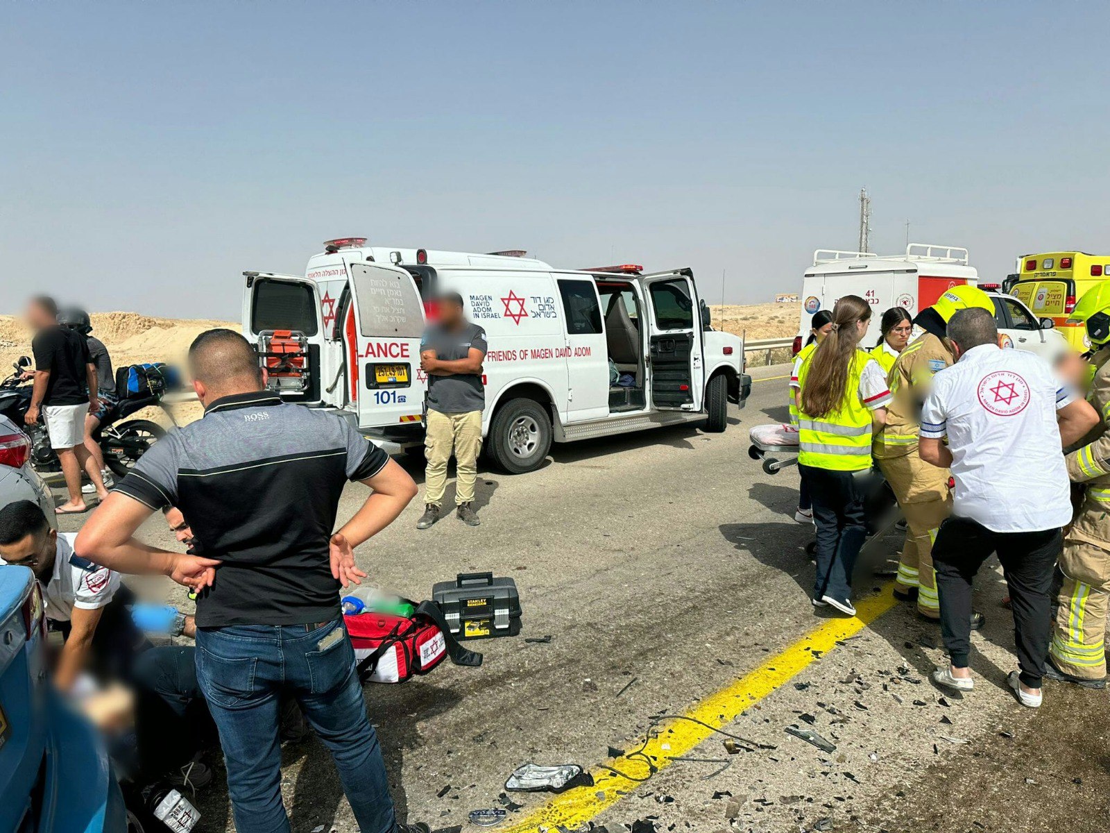 חובשים ופראמדיקים של מד"א העניקו טיפול רפואי ולאחר נסיונות החייאה קובעים את מותה של אישה כבת 60 ומעניקים טיפול רפואי ומפנים במסוק מד"א ובאמבולנסים של מד"א לבית החולים סורוקה, 4 פצועים, בהם: 2 במצב בנוני ו- 2 במצב קל.