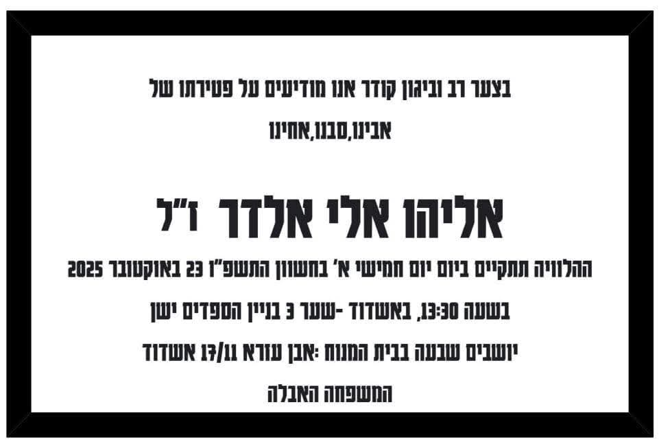 עצוב בלב: אלי אלדר, האיש הדגול הזכור לטוב, הרכז והמחנך האהוב שלך מקיף ד' לדורותיו, אלי אלדר הלך לעולמו. בנו פרסם: אבא שלי אהוב שלי החיים שלי, ההלוויה היום ב13:30 בבית העלמין באשדוד. המשפחה תשב שבעה בבית המנוח ברחוב אבן עזרא 17/11.