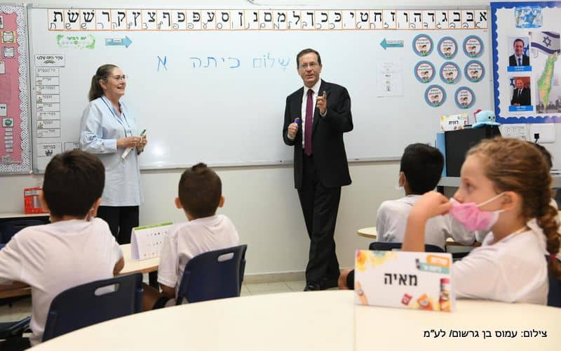 בכיתה א' שמעו הנשיא ורעייתו מהתלמידים החדשים על ההתרגשות עם פתיחת הלימודים ויומם הראשון בבית הספר. מיכל סיפרה לתלמידים שאמה הייתה מורה בבית הספר בו למדה: "כשהגעתי לכיתה א' הייתה התרגשות מאד גדולה אבל ידעתי שאמא שלי נמצאת באחת הכיתות בבית הספר ומאד נרגעתי. לדעתי יהיה לכם ממש כיף." הנשיא עבר לשיעור עברית עם התלמידים הטריים ושאל האם הם יודעים איך כותבים את המילים "שלום כיתה א'" וביקש את עזרתם באיות המילים בזמן שמיכל כתבה אותן על הלוח.🛑🛑🛑