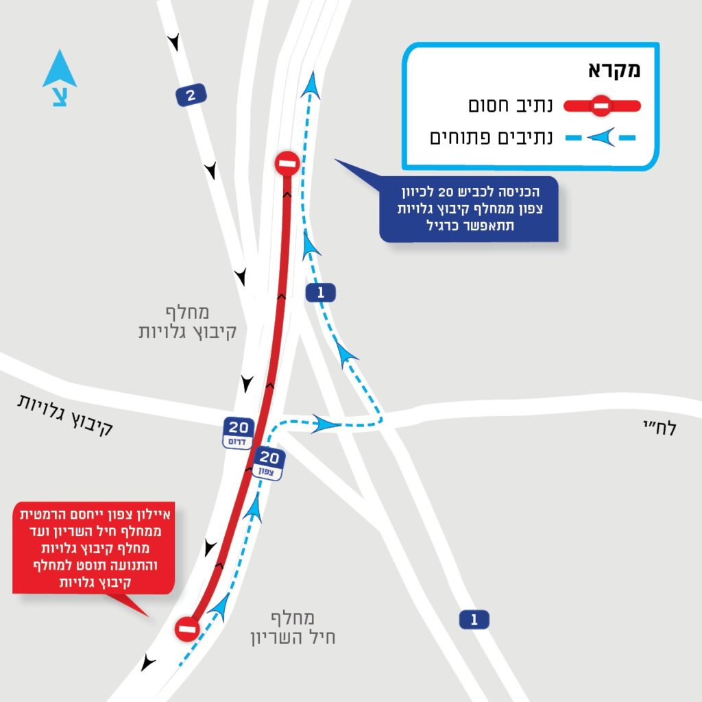 - התנועה בכביש 20 לכיוון צפון תיחסם בגשר חיל השריון ותוסט למחלף קיבוץ גלויות.