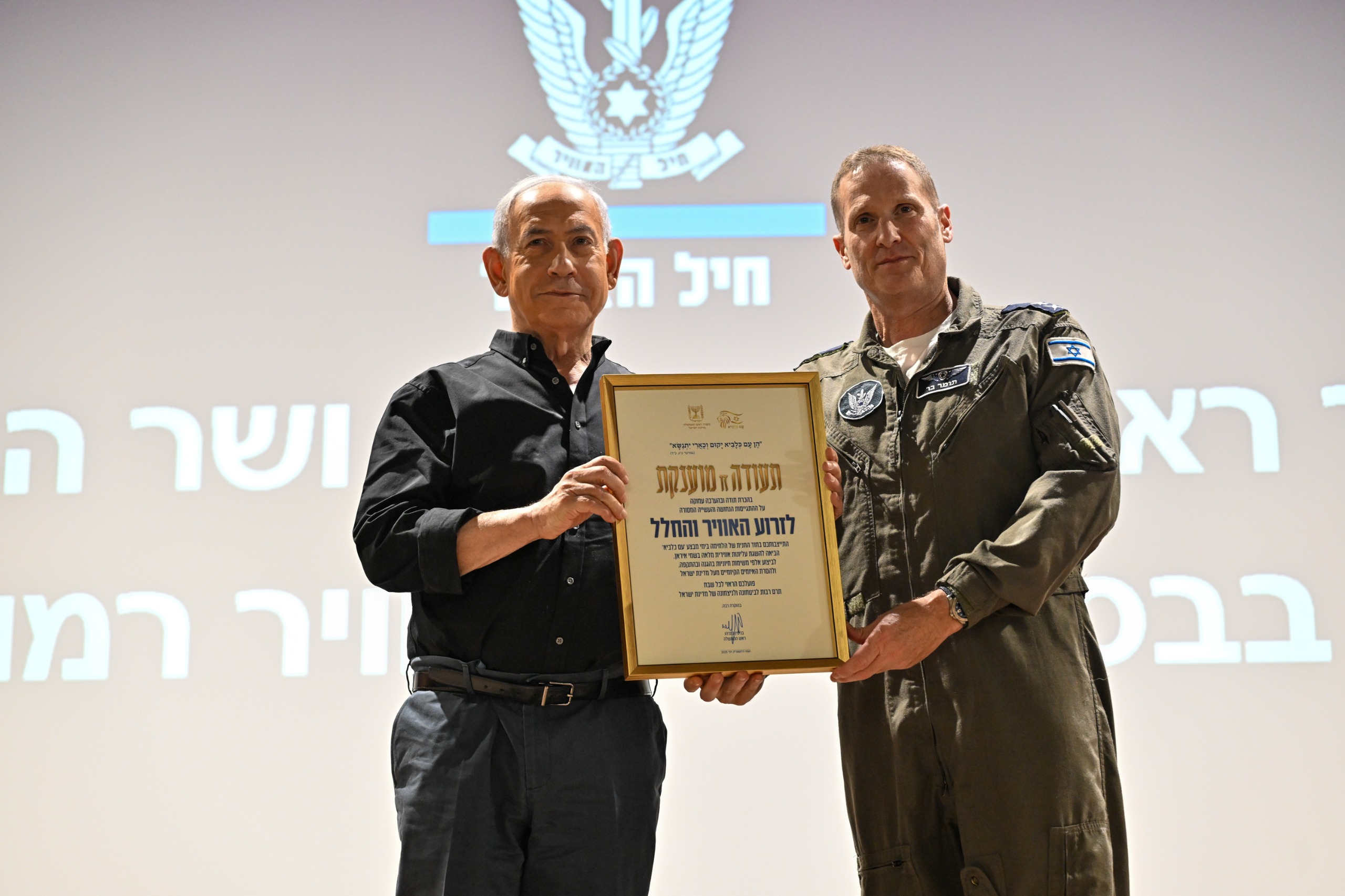 ראש הממשלה נתניהו העניק למפקד חיל האוויר תעודת הוקרה על פעילות החיל במהלך מבצע ״עם כלביא״ בטקס שהתקיים בבסיס.