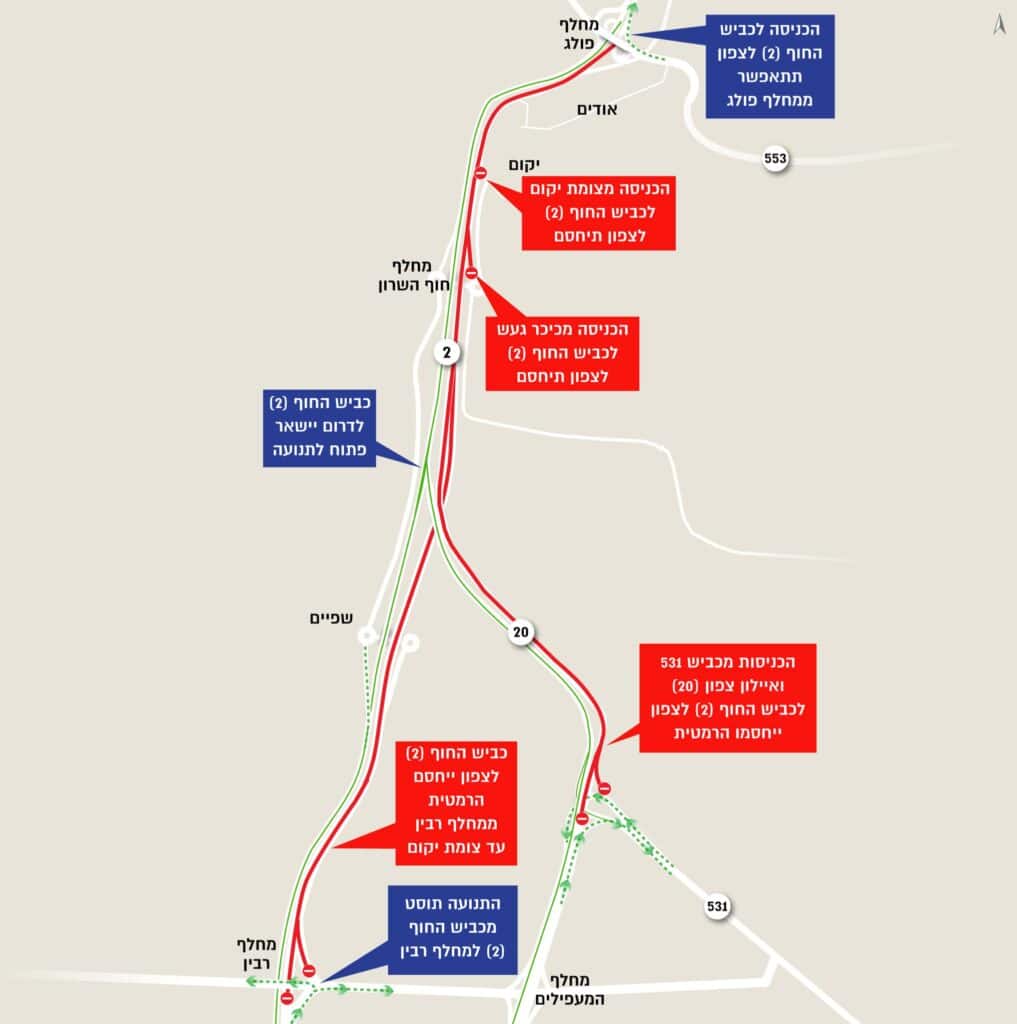 התנועה מכביש 2 ומכביש 20 לכיוון צפון תוסט לכיוון מזרח ולכביש 531