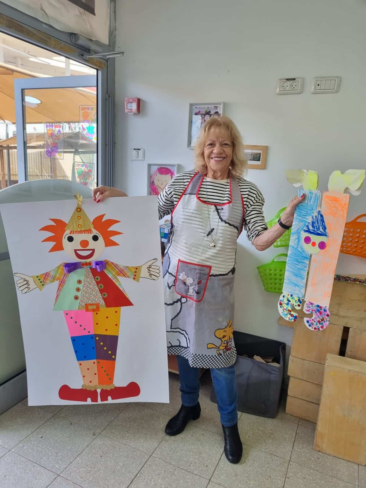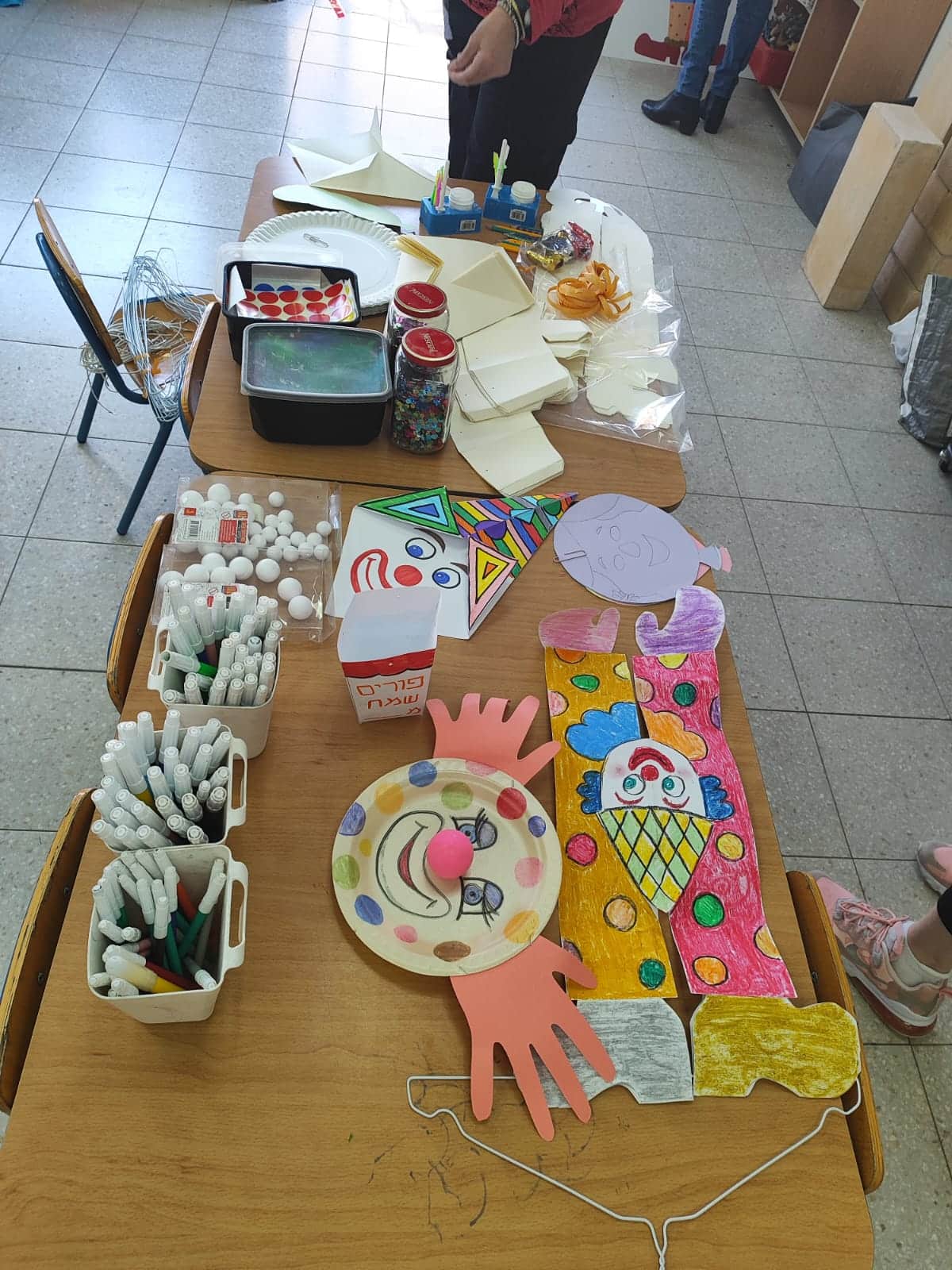 צוות המתנדבות העביר לילדי הגנים מגוון סדנאות להכנת מסיכות ססגוניות, ליצני בלונים מקרטונים מצוירים, אשר הוצמדו לליצן גדול ממדים, פרצופי ליצנים על גבי צלחות מקרטון, ליצנים שנצבעו ונתלו הפוך על קולבים וקופסאות למשלוחי מנות.